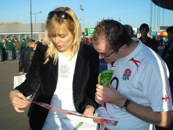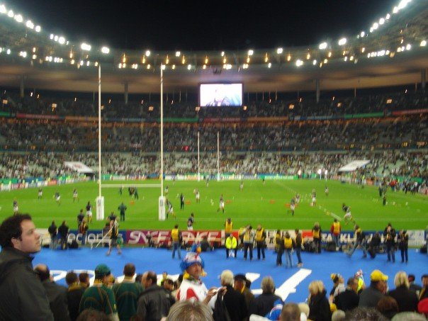 I walked through the crowds staring at my ticket soaking in exactly what I had in my hand. I was like Charlie with the Golden friggin ticket. The emotion to follow, the exhaustion tomorrow from all the energy burned. The next worry was as to whether it was real or not. I was TOTALLY unprepared for the fact that I might not be able to get in still – it could be a very good fake. Or, stolen? I handed my ticket to the guard with one eye open and my shoulders hunched, I was ushered forward after the green light appeared. OH MY GOD! This was it, I was in, I as actually going to be there in the stadium. I waved at the others at the gate to let them know then . . . . . broke down. Now we are not talking a few tears here, we are talking Niagara fucking Falls from the eyes with short intakes of breath too – nearly hyperventilating. A lovely sight to see I am sure! But was I happy? You have no idea, trust me! No-one could have been more ecstatic more like. I was far too nervous to even walk to my seat straight away in fear of just totally losing it. I decided that there were 3 phone calls I had to make. I was in the perfect state to call the parents and admit that I was never planning on just watching on some big screen and that I had just paid what I had for a ticket that I had every intention of finding. (They though that the Rugby Village would do on the big screen – how little they really know me!!!) I phoned my friends under the Eiffel tower who were without hotel and had driven over to watch it there. I was sworn at badly and then hung up on – jealous?!! I then called a rugby playing friend who had been reassuring me since Thurs evening that I would find a ticket –how right he was. He seemed as emotional as I was that I had actually managed to get one – bless! I then texted several people (am dreading the phone bill) namely my season ticket neighbour, Rach who was up in Newcastle with the rest of the Supporters’ on a trip that I was meant to be on and had fully paid for. I calmed down – well, a little – and went to my seat. My superb last min Rugby World Cup Final seat. I was off again, this was turning into far too an emotional day to say the least and the match hadn’t even started!