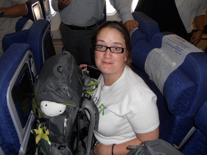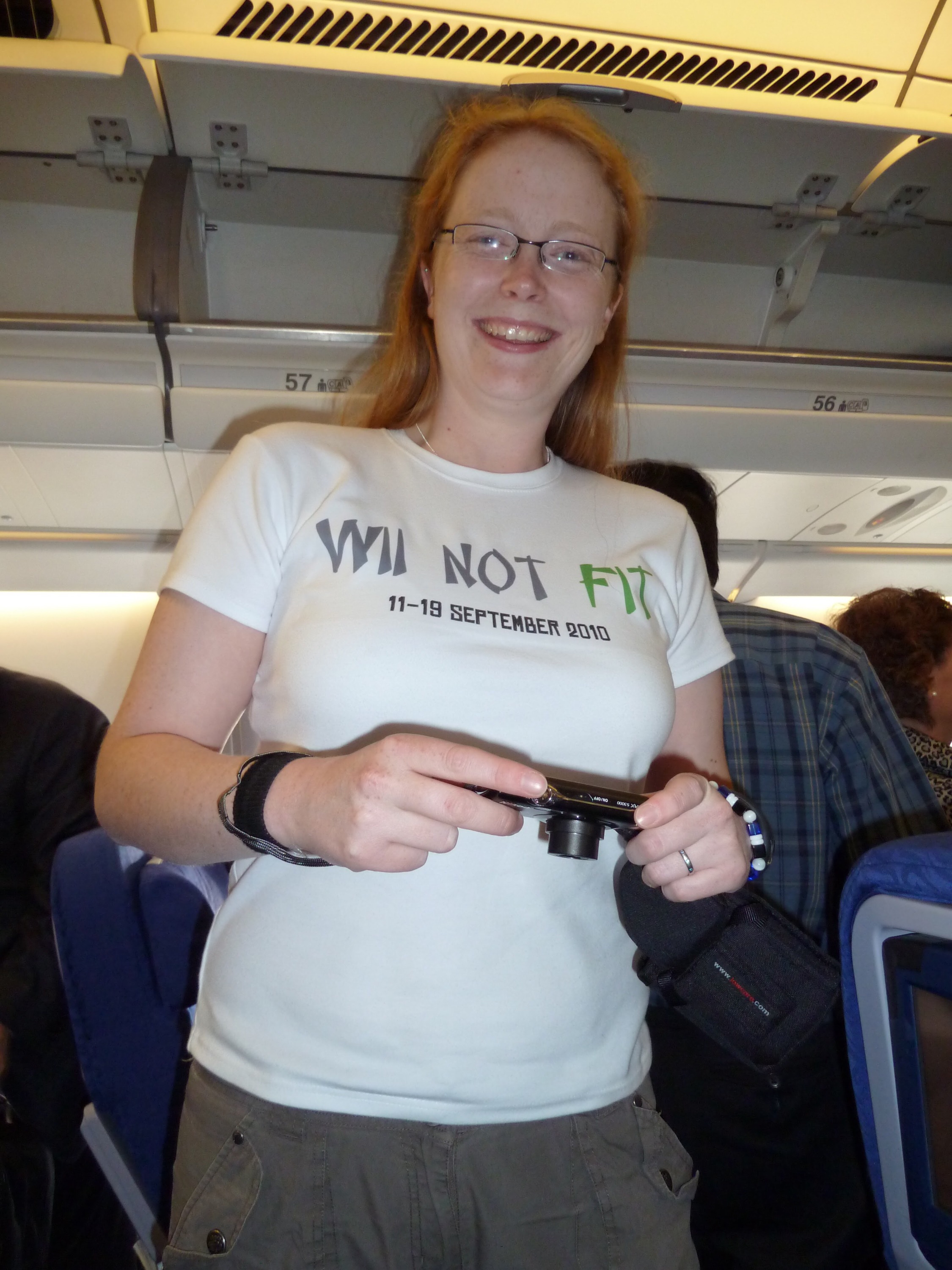 Then we headed straight to the pub for a much needed ‘calming of the nerves’ drink! It was here that I realised that I had left my hat behind. Sadly there was not an appropriate outlet in Duty Free for me to find one. I did get a bigger memory card and a proper camera case so I could carry all the bits together. I was sweating lots and so decided to stick with the rugby top for now and change into the Wii Not Fit one on the plane in an attempt too freshen up. I sent a few last min texts and updated my status, even received one too (thank you Emmie, timing was perfection!) and it was aboard we went, nervous giggles ALL over the place!!