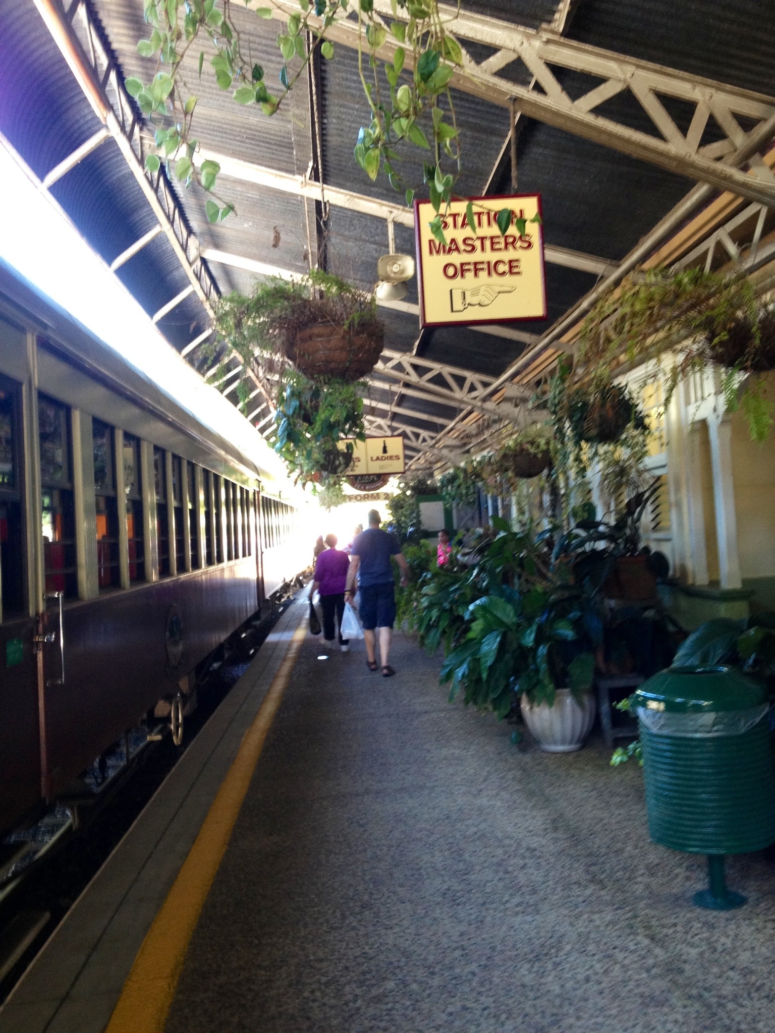 After a pint at the top a little meander around the town and a snoop at some of the markets and shops we headed to the train station as we were going to be getting the scenic railway back to where we were dropped off. The station in Kuranda is a very quaint little place, I could almost see a Miss Marple or a Poirot being filmed here! Of course the train that we were on was a very old fashioned one, with very old school carriages, I most definitely would not like to do this trip in the scorching heat, it would be seriously stuffy. It’s a 34km stretch that seemed to take forever to travel with 15 tunnels but most importantly some pretty spectacular views out into the rainforest and back over Cairns. We were all tho definitely looking forward to disembarking when the time came.
