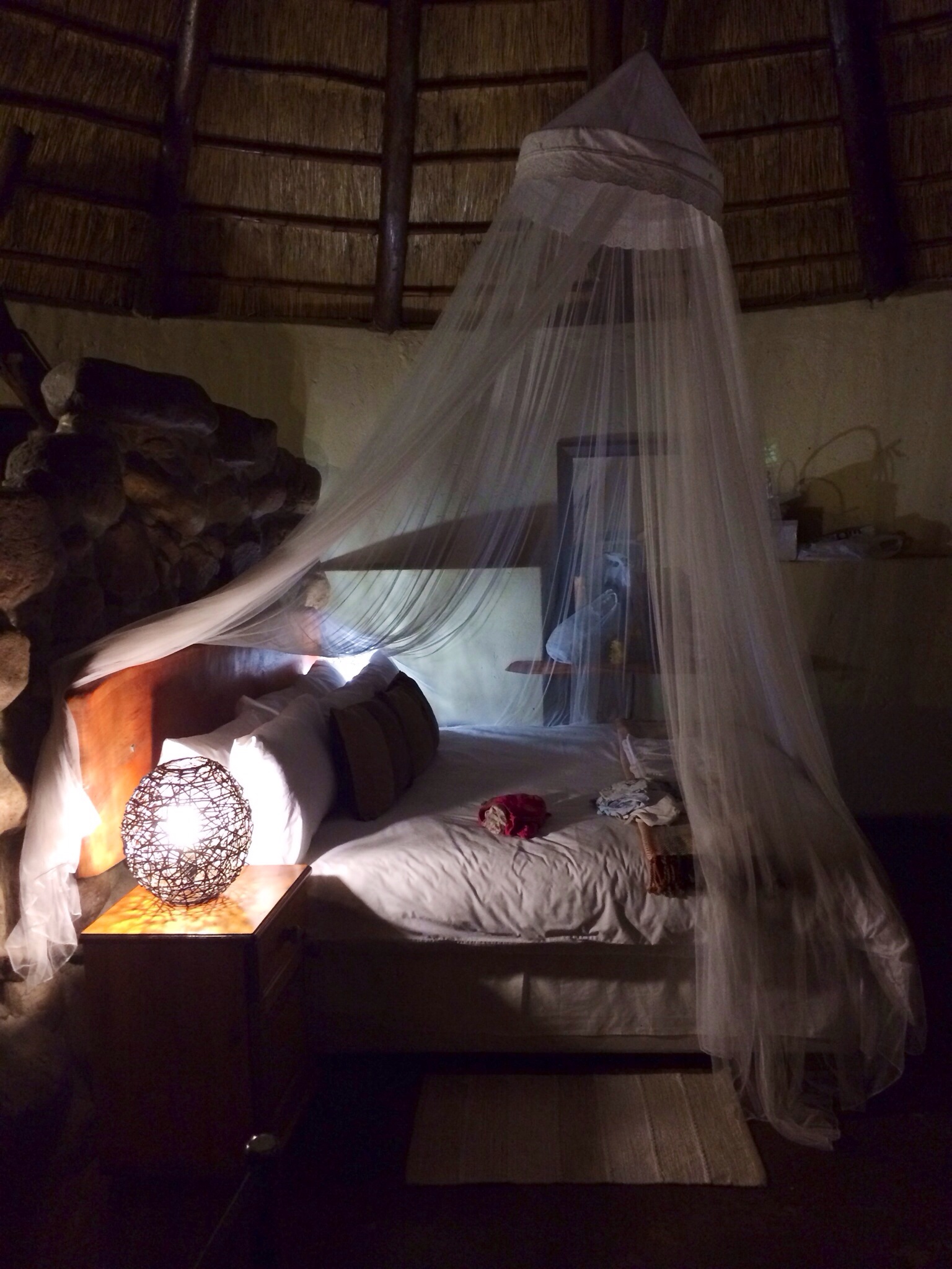 We went and dropped the majority of the stuff down in ‘Zebra‘ – the honeymoon suite where I was staying with Lauren for the night, then went and had a look in the Boma at the set up and so on. It really was starting to come together, the fairy lights were up, the tables were nearly all laid out and the table runners & chair ties were in. It gave us all tingles! We had a drink with her parents on the veranda by the bar overlooking some of the landscape & I officially had my first beer since September!!