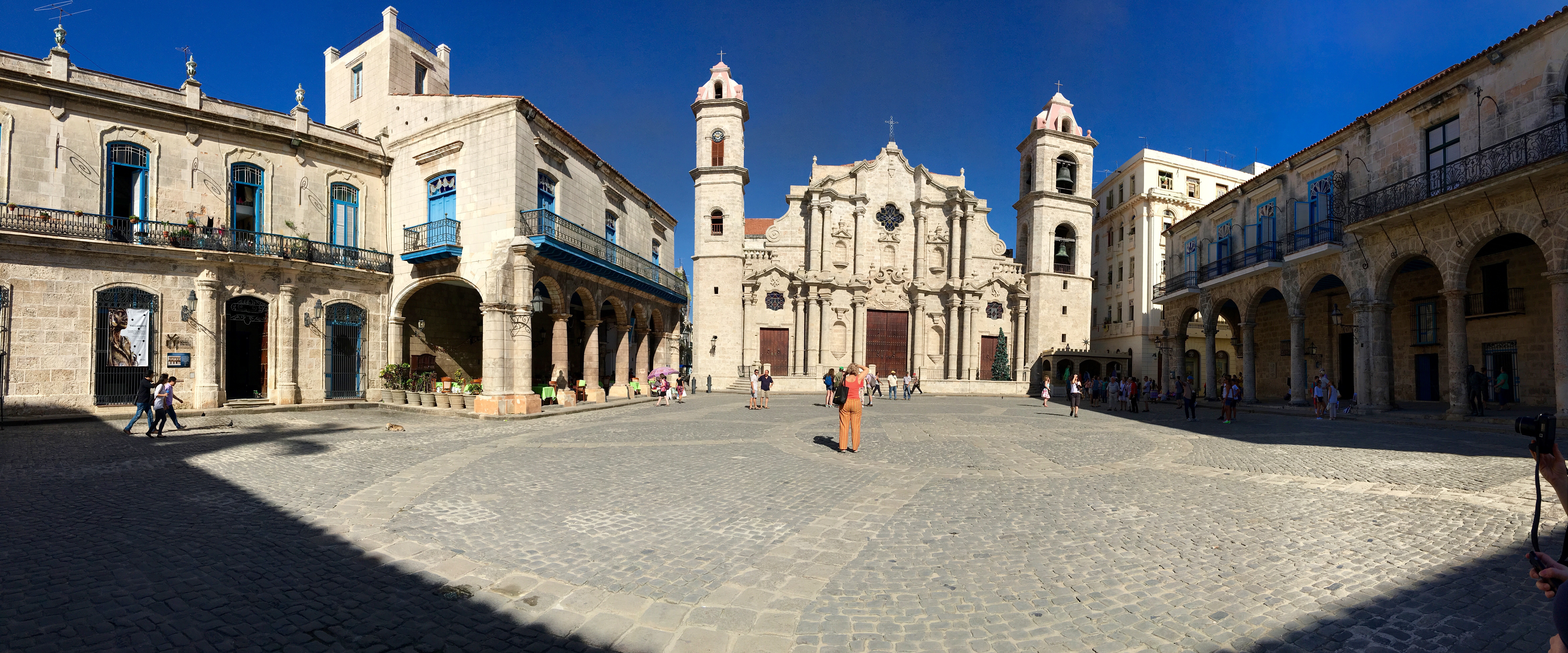 Our walking tour took us primarily to the four main squares in the old town. The first being the Cathedral Square where we heard a little more about the religion in Cuba. Primarily Catholic but there is also Santeria. It stems from the beliefs of the Yoruba people of Western Africa who would have originally come over to Cuba as slaves. As they were forbidden by the Spanish to practise their faith the slaves used to find ways of hiding images of their gods behind those of Catholic saints to whom they we forced to pay homage. It was because of this that for example the patron saint of Cuba is the Virgen de la Caridad del Cobre and she also embodies the orisha known as Oshun who is the goddess of femininity and are both believed to provide protection during birth. She is always depicted in yellow to represent honey and sweet things and of course, fertility. The cathedral was dedicated to her. A rather baroque looking building with rather splendid three other sides hat formed a courtyard effect. It was here that we established that Cubans always spot the tourists and are always wanting a contribution for their efforts. The two ladies who planted smackers on one of the gentlemen on the tours face to the elderly gentleman in all his finery pretend smoking the biggest, fattest cigar that you’d ever seen!