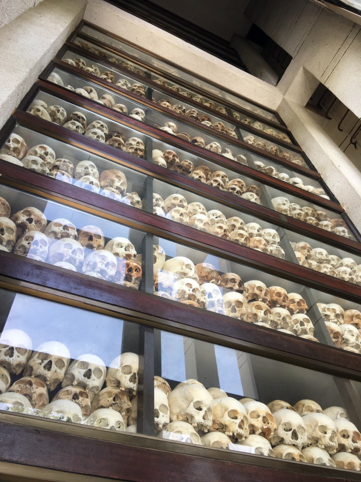 First we paid our respects at the (Buddhist) Memorial Stupa, erected in 1988, to honour the victims of the atrocities that took place here. This particular location is only one of over 300 locations currently been identified across Cambodia and it is believed that at this location ALONE 17,000 men, women & children were killed. I think I had read about the tower of skulls prior to my visit but had not really taken it in. It was breathtaking, as in a shocking way. It wasn’t just a tower of skulls, it told you on the glass as they were separated into sections by sex, age and what was presumed to have happened to them from the excavations. I spent a while taking in all that these victims were put through by reading the labels on all four sides. 8,000 skulls lie here in sections. Each individual was savagely tortured before being brutally murdered in some of the most barbaric circumstances and this was something that was happening around the time my parents were getting married and up to the first year of my life. Bullets weren’t used as they were considered to be wasted if used to murder in this way. This happened IN my lifetime.