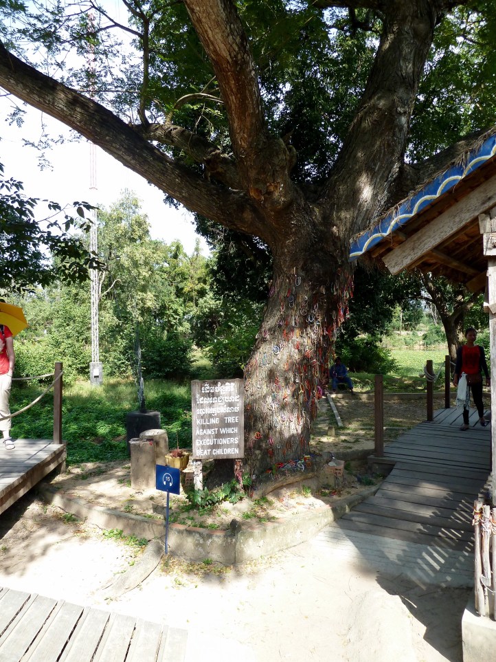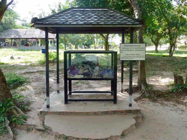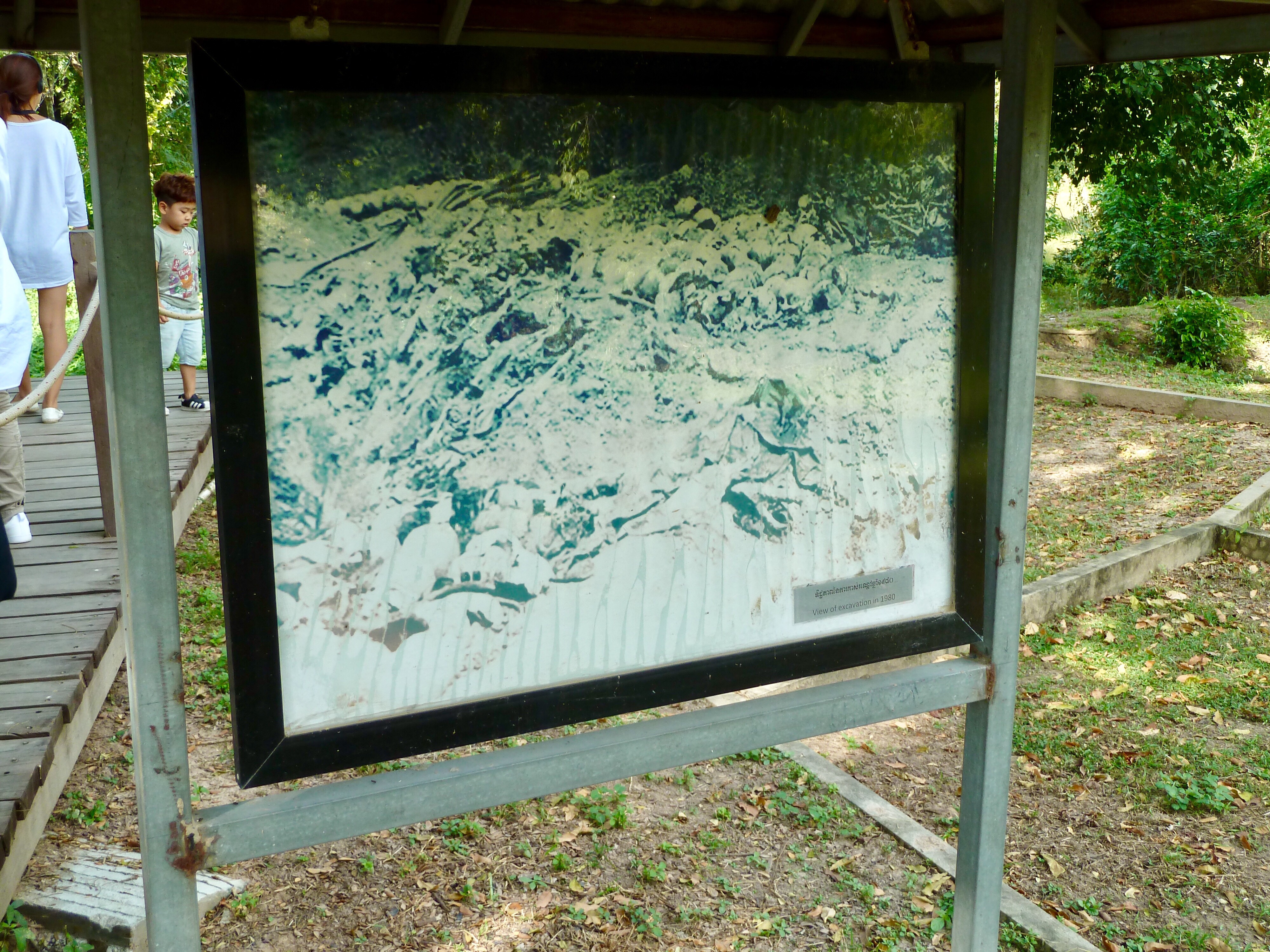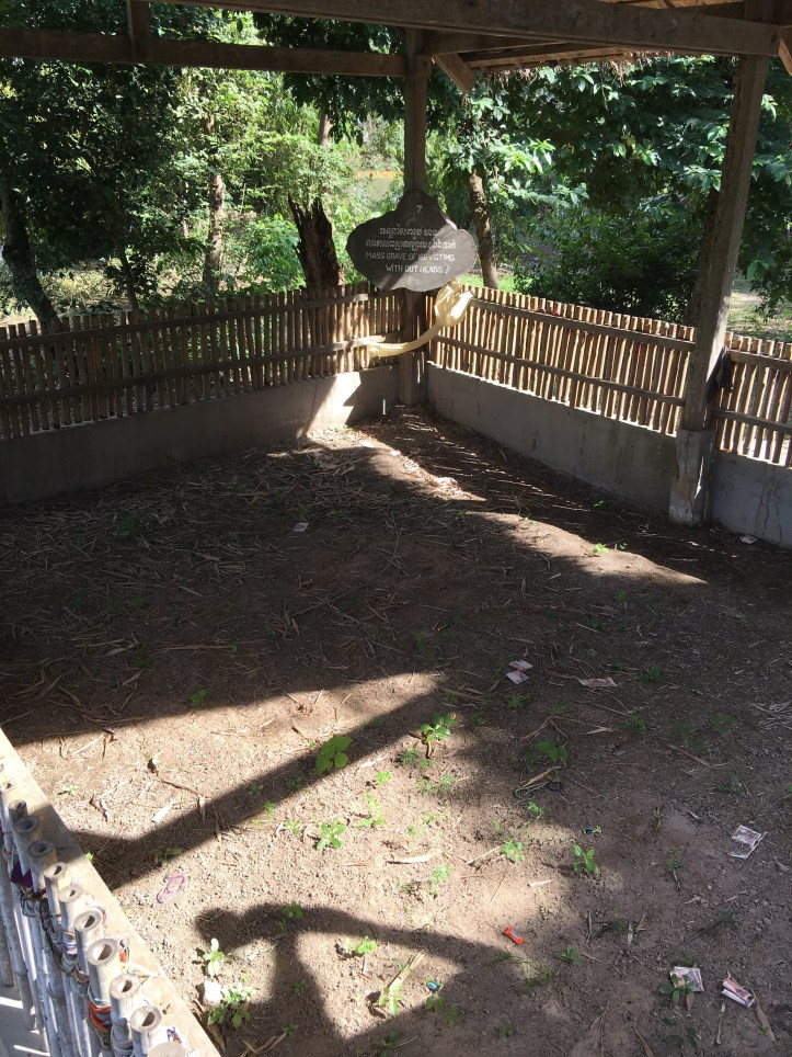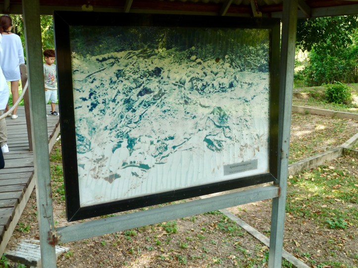 People were rounded up, mainly from what was the prison at the time called S-21 a former primary school that we were going to visit later the same day. Mainly in the dead of night after being blindfolded and brought out here on trucks. Loud music was played from a speaker placed high up in a tree so that the noises from the victims were not heard from neighbours at the time. There seemed to be no specific criteria for those destined for a gruesome ending, if you had a job, were an intellectual and even young, tiny children were taken. All to be ‘re-educated’ they were told after interrogation to learn more – nope taken to be slaughtered. The thing I think that got me the most about this site is that it is still only part excavated. There are still remnants of bones or teeth and sometimes even clothes that have been brought to the surface of the ground through rain and so on. Only in the past few years apparently has the wooden walkway been built as visitors had commented that it was like walking all over their graves to be walking direct on the ground.