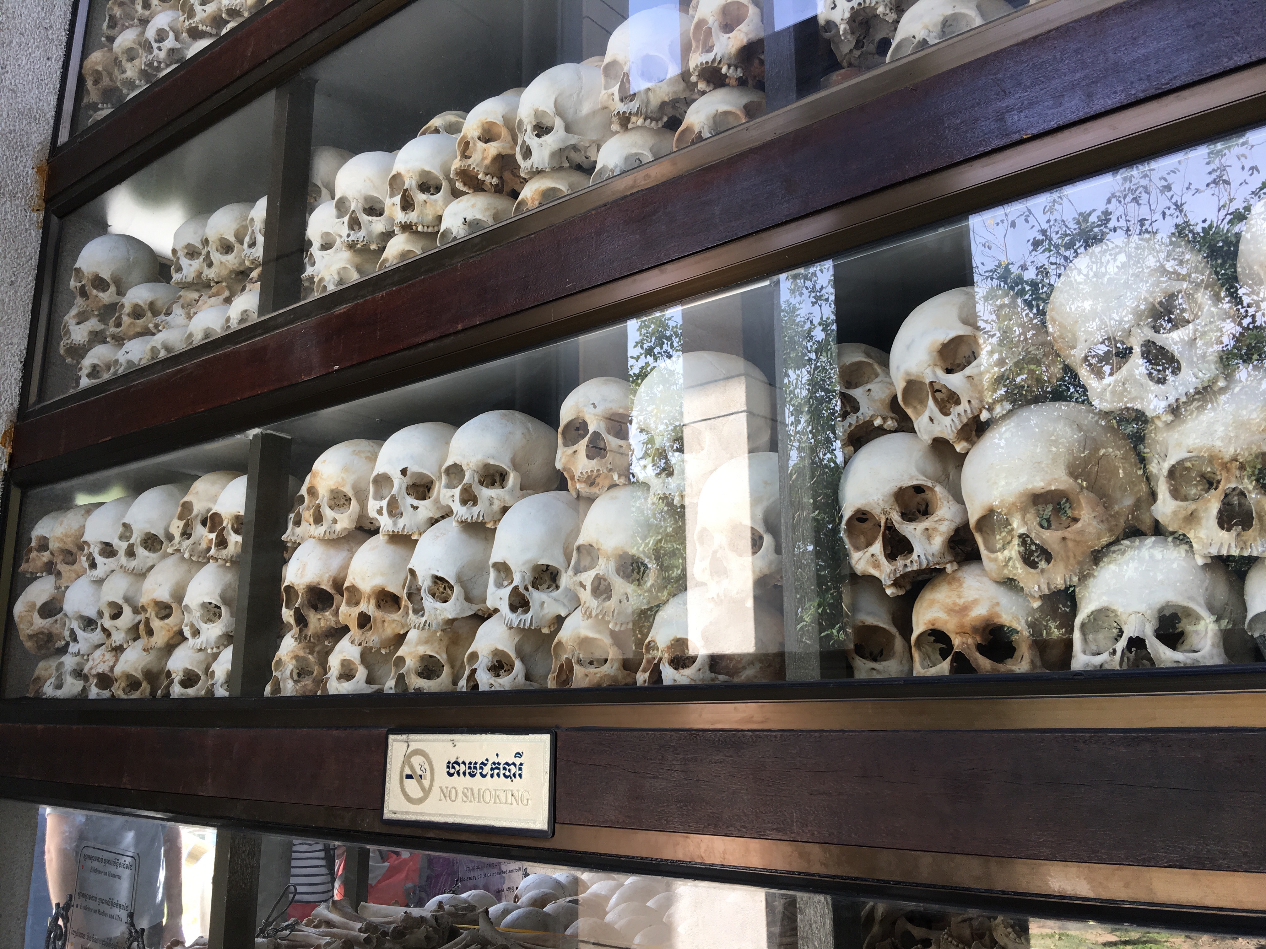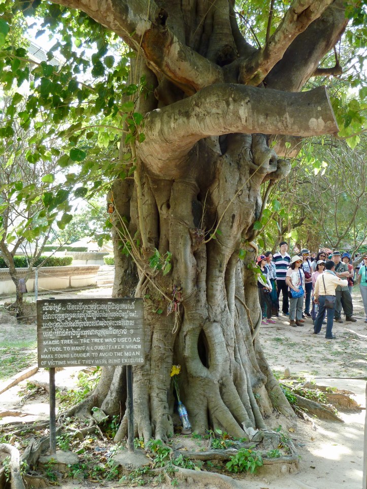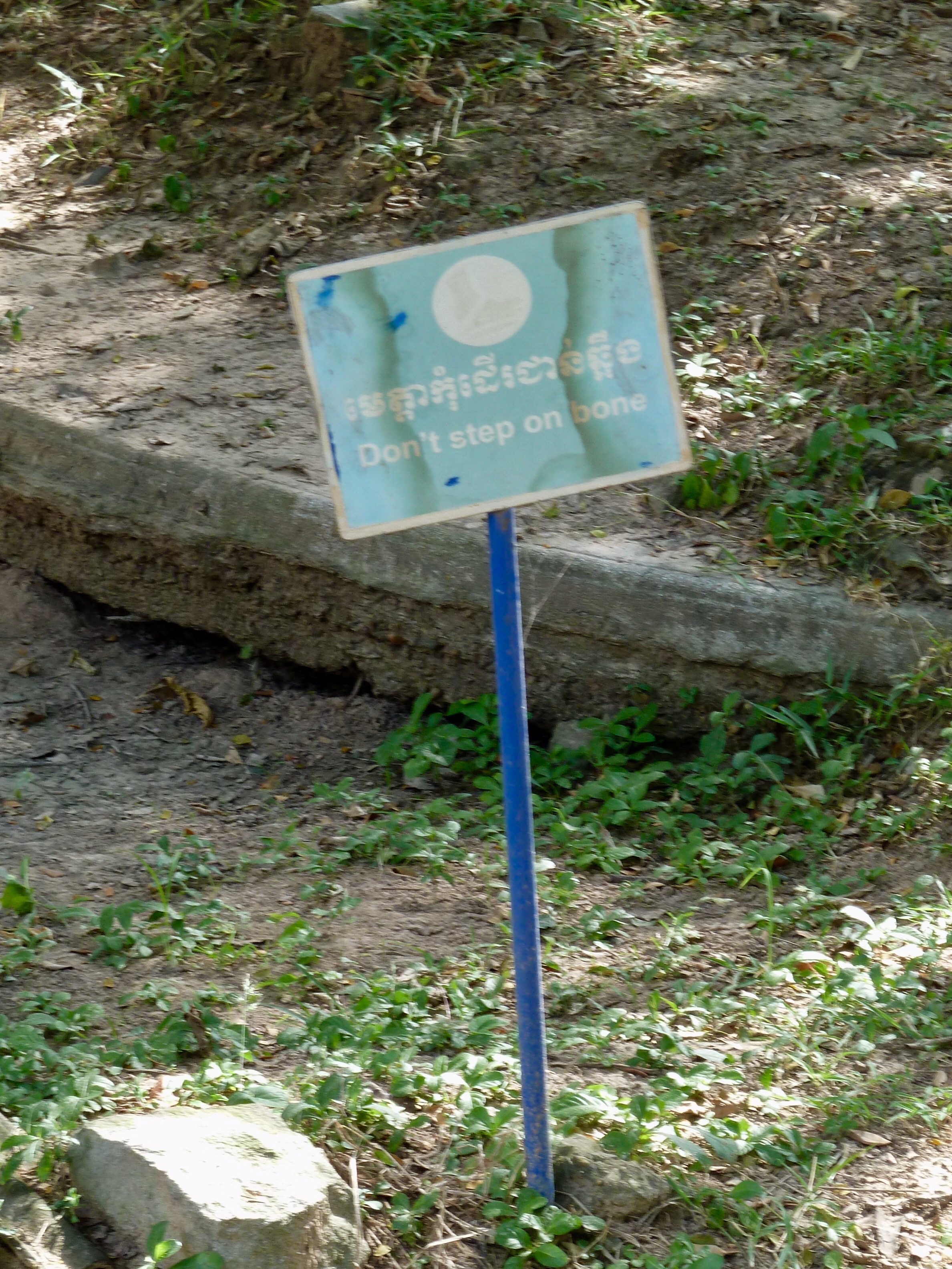 People were rounded up, mainly from what was the prison at the time called S-21 a former primary school that we were going to visit later the same day. Mainly in the dead of night after being blindfolded and brought out here on trucks. Loud music was played from a speaker placed high up in a tree so that the noises from the victims were not heard from neighbours at the time. There seemed to be no specific criteria for those destined for a gruesome ending, if you had a job, were an intellectual and even young, tiny children were taken. All to be ‘re-educated’ they were told after interrogation to learn more – nope taken to be slaughtered. The thing I think that got me the most about this site is that it is still only part excavated. There are still remnants of bones or teeth and sometimes even clothes that have been brought to the surface of the ground through rain and so on. Only in the past few years apparently has the wooden walkway been built as visitors had commented that it was like walking all over their graves to be walking direct on the ground.