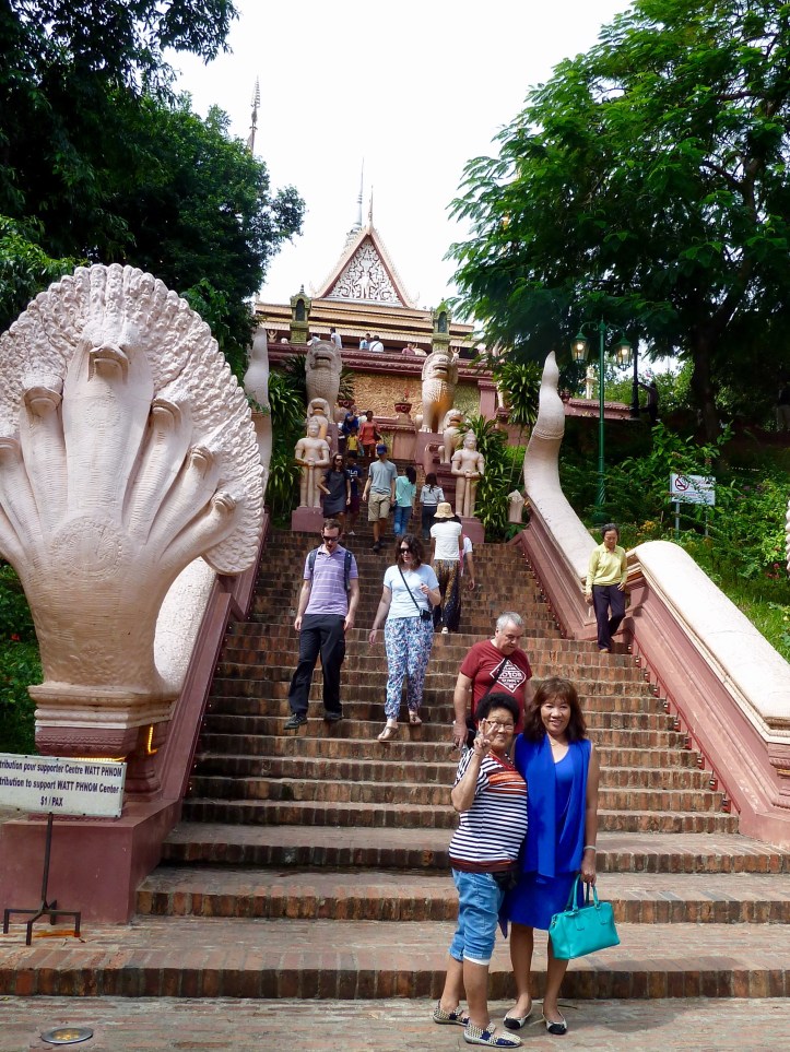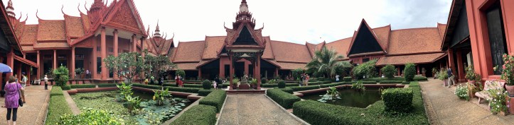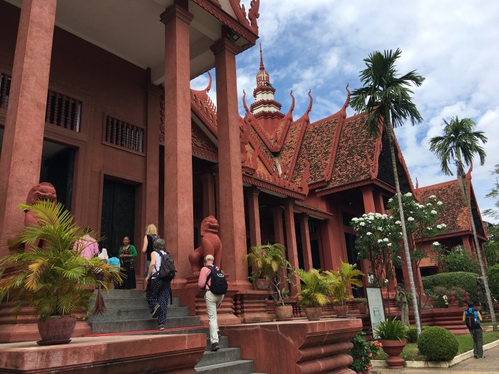 From here we headed to the National Museum of Cambodia which we could have actually walked to from the hotel if needed as it was just round the corner, I’d stumbled across it the previous evening on a stroll having had a tactical nap and shower after the flight over. It’s a terracotta coloured building built in the early 20th century with a beautiful courtyard garden. The sculptures from across the centuries are in chronological order and we had our own guide that showed us round with our own commentary. It seemed that the majority of the pieces had come from Angkor Wat and surrounding temples which kind of made you wonder of the was actually anything of any significance left at the sites! Many Buddha, Vishnu, Shiva, Laksmi statues, enough to make you feel some what lackadaisical about them come the end of the tour. I’m sure that they will feel more beautiful and relevant when we see any at the temples themselves later on in the week. The religion in Cambodia is a real mid of Hindu and Buddhism as far as I can work out, quite confusing initially to be seeing Vishnu statues in a country I thought was Buddhist bit according to our guide they celebrate all gods. Buddha is seen usually in 4 different forms, teaching, meditating, and I can’t remember the other two (will fill in later!) and we saw enough of each in the museum to sink a ship!! It was getting ridiculously hot by this stage but we still had one more thing to visit before our lunch stop Wat Phnom which we got back on the bus to head out to.