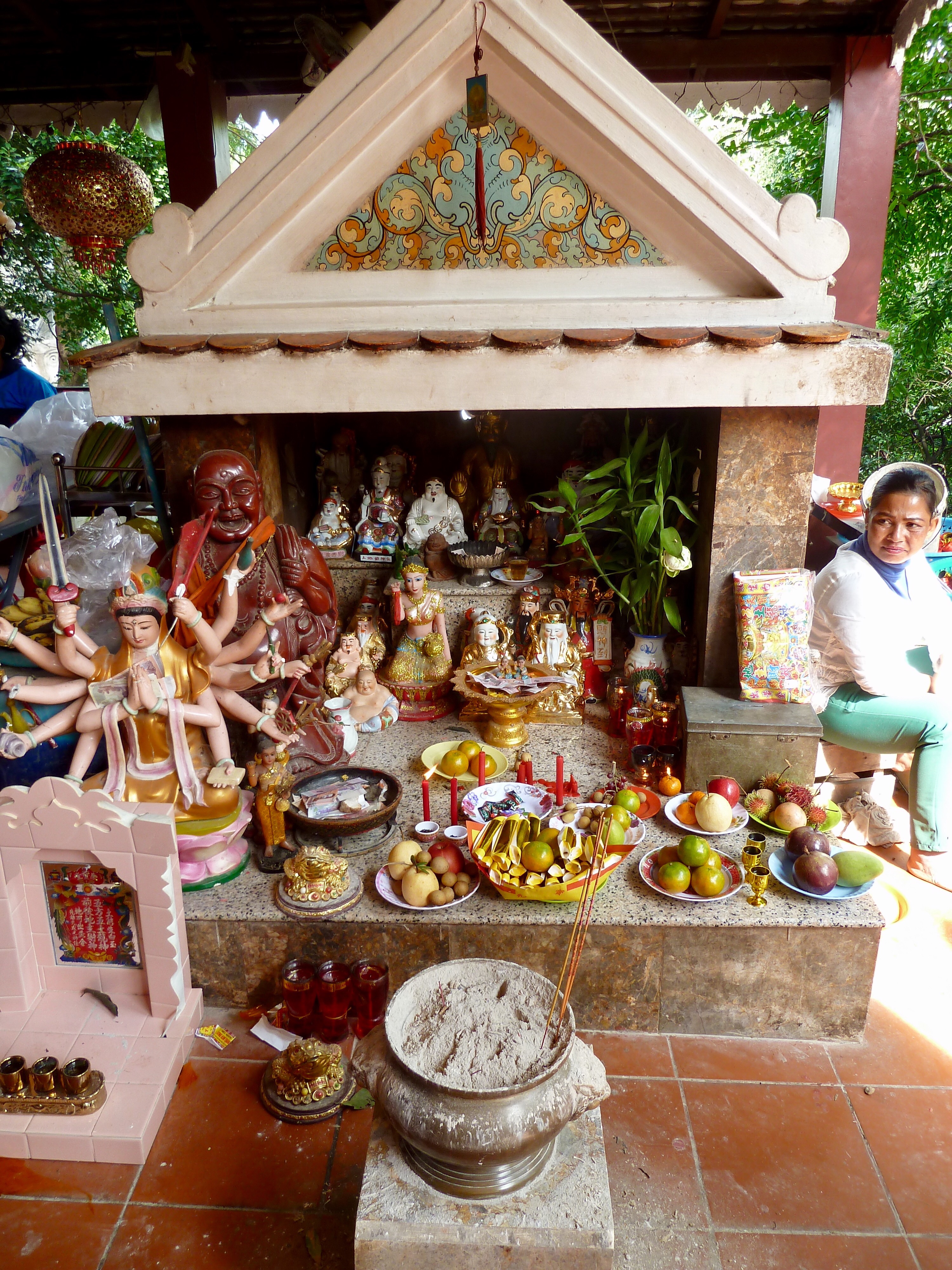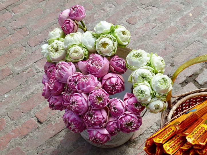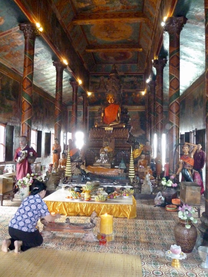 Wat Phnom is the only ‘hill’ in the city standing at 27m high on top of which is a Buddhist temple and multiple shrines at which there were many of the locals laying gifts to Buddha and to other gods as it is new year this evening. Lions and naga (a mythical serpent) adorn the eastern staircase which was how we accessed the temple. Many of the locals come here to wish for good luck and if it comes true then return to bestow gifts to the gods such as lotus flowers, fruit, suckling pig (this might have been an exception to the rule tho!) they also set free birds to take away their bad luck (they often return to the cages as they are trained to so the guide book tells me). It was ridiculously busy and there were numerous beggars and so on trying to sell us things with signs in English about how they are trying to make a living. On the one hand one wanted to buy abut the cautious soul in me avoided like the plague, mindful of tourist scams and the fact that is then be surrounded by others trying to sell me similar things.