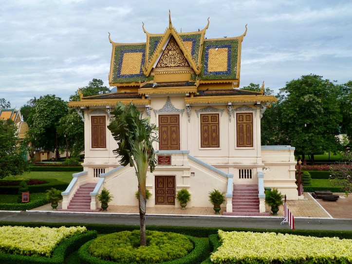 Being the official residence of King Sihamoni there are only a few buildings actually open to the public. The Throne Hall being the main one is tipped by a 59 Meter high tower which was inspired by the Bayon at Angkor an tod was inaugurated by the king in 1919. It’s used for coronations and ceremonies such as the presentation of credentials to diplomats. Whilst the building was kept in tact as I mentioned by the Khmer Rouge the contents of some of the buildings that were on display were destroyed. You weren’t allowed to take photos of the room itself. It was long and had a splendid full length carpet in the same style of the mosiac on the floor surrounding the room. The throne as you can imagine was incredibly ornate and golden and the ceilings were adorned with paintings of a Cambodian story similar to an English one (at this moment I can’t remember what it was). To the right of the Throne Room was a separate house that is still used for meetings today that was also where the King would once alight the elephants – his chosen mode of transport for centuries for when he went out to the countryside to visit his people, however clearly modern modes of transport are more viable in this day and age!