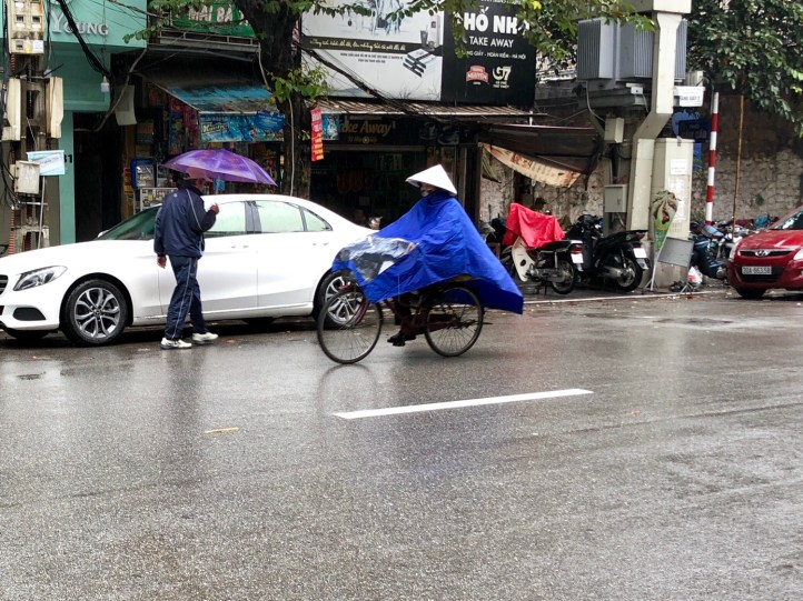 Our first walking tour was in the Old Quarter of Hanoi, which was good as it was nailing it down with rain as we first walked out. Negotiating the traffic for every direction and of every form is something of an art form. In the UK we have pedestrian crossings painted on the ground and only on a few occasions do cars ignore them. Here THAT is the norm but it’s scooters, 15 years ago it would have been bicycles and it wouldn’t surprise me to see more cars on the roads here in 20 or so years. Hung told us that the average car price for nothing fancy was $25,000. In my book that’s A LOT when the average wage is around $150-200 a month. But there would be no room for them all anyway were they to start becoming more affordable. With the rain beating down they were all wearing ponchos that have a see through rectangle at the front that covers the handlebars and lights and so on. Clever. Here was one lady using the same that I spotted on a bicycle.