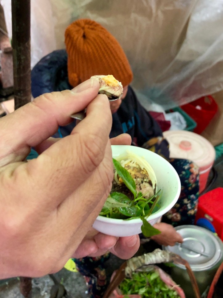 The historic Old Quarter was a maze of packed streets that were an explosion on the senses with the noise of the scooters to the smog from their engines. The sidewalks are crammed with parked scooters and the small shops were stuffed full of a plethora of goods which often spilled out and onto the side walk, then you have the shopkeepers making their simple meals on the pavements too – some selling food and some just creating for themselves. You have the street sellers passing with fruits freshly picked and presented in bamboo baskets and sellers on scooters with a record player shouting out what they were selling as they slowly made their ways down the streets. Food hygiene leaves A LOT to be desired and although Hung kept telling us the food would be ok but the issue with the hygiene would be more to do with how they washed the plates and so on rather than perhaps the food itself. We had heard their staple breakfast was a duck embryo boiled and still in the shell of the egg. None of us were keen to try, a step to far in my book. None the less Hung got one for himself and we all stood round in the rain as he showed us how it was prepared and how it was eaten from a street seller. My stomach churned and I’m sure I wasn’t the only one!