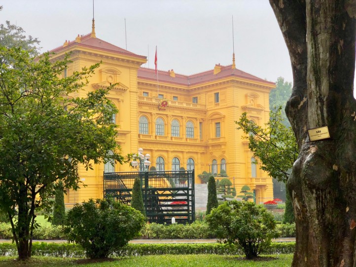Popping out of the Old Quarter by the Hoan Kiem Lake we met our bus which would be swooping us up and ferrying us away from the hustle and bustle of the street and the peace of a bus – all kitted our with WiFi – too as we headed off through the busy traffic to the complex where we would see the Ho Chi Minh Mausoleum and other sites on the complex. It was all rather surreal as you were literally allowed nothing as you walked around – everything had to be handed in and you were walked like working ants from the ticket office to the Mausoleum itself and encouraged just to keep walking around the frail body of Uncle Ho. I’m JUST not sure if it was/is him lying there or not?! He’s of course been embalmed (in Russia apparently where he returns for a month every year for ‘maintenance’) and lies in a sarcophagus surrounded by guards who are members of the National Army who were all wearing the ceremonial dress of white (this included white wellie boots which made me think of fish mongers or butchers) and we all thought that honestly they looked a little ridiculous – not that I was about to tell them that! It looked like they were cheap as sh*te sets from a fancy dress store rather than OFFICIAL uniform. I was pulled along at one point – still not quite sure why. A member of the group was asked to take her glasses off – they were those dark ones that turn into dark glasses and they had ‘gone dark’ and another was pointed at as we shuffled past as he had his hands in his pockets. The whole area was an open expanse and traffic free and you could tell that there has been a soviet influence in the design as there is plenty of opportunity for parades in front of the Mausoleum. What makes me so angry about it all with the pomp & ceremony is that it’s clearly been stated on a number of occasions that actually Uncle Ho was not in favour at all – his dying wish was that his ashes be scattered in a number of locations the length of the country. We also saw the stilt house where he actually lived in the gardens, he chose this over the Presidential Palace whenever he was in the city. It’s been preserved just as he left it and sits on a pond FULL of koi carp. The actual Presidential Palace is still used today and so visitors are unable to go inside of it but it’s a bright sort of orangey yellow colour and immediately reminded me of the building up on the hill as you drive out of the centre of Bristol on the M32. Apparently all of the presidential palaces are this colour throughout the country.
