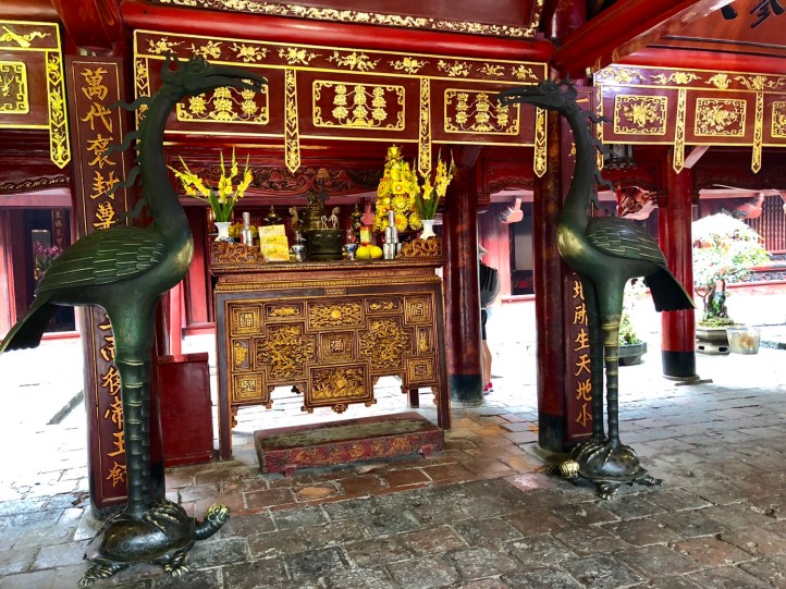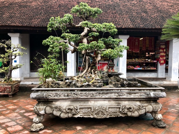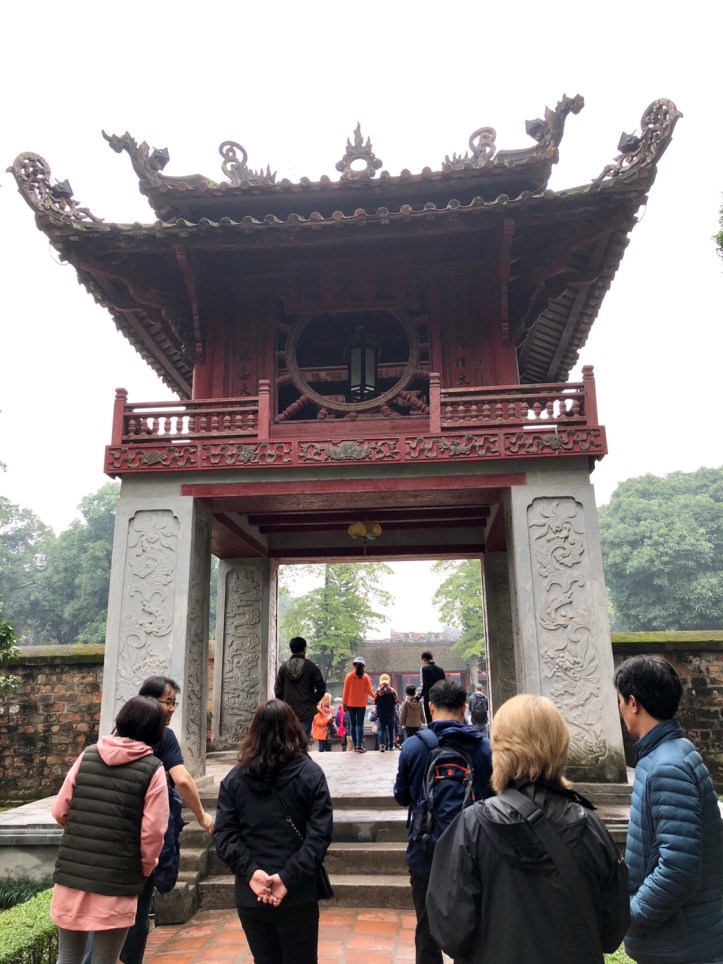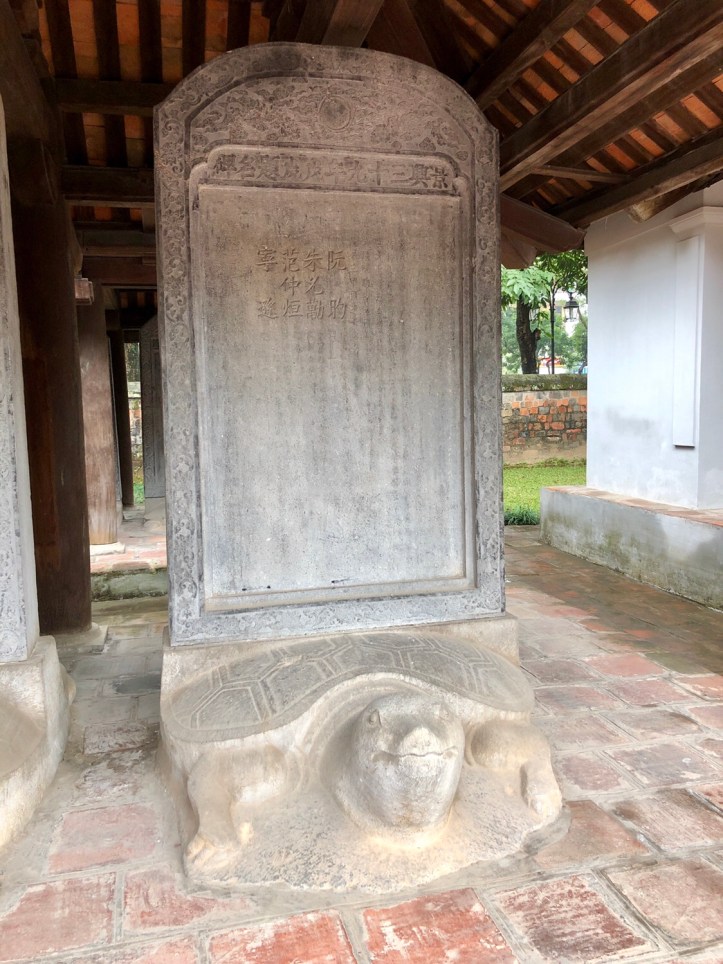 After finishing up at the Ho Chi Min Mausoleum Complex we visited the Temple of Literature which is also known as Confucius Temple. Not so much a just a temple in itself but there were a variety of things to see. All beautifully calm and serene whilst the scooters manically circle around on the roads. There is a rare example inside of early Vietnamese architecture which houses the honoured amongst Vietnam’s finest scholars and writes with literary accomplishments. These are all carved into stone tablets which are held on the backs of turtles – one of the three most sacred animals in Vietnam along with storks and lions/dragons. There are a number of impressive gateways and one of them is a symbol of Vietnam and Hanoi and is found in one of the many notes (of money). There are lots of bonsai trees everywhere in pots and many of them seem to have stories in them with pagodas and little people in. Something tells me it’s the story of Confucius himself but I didn’t get clarity.