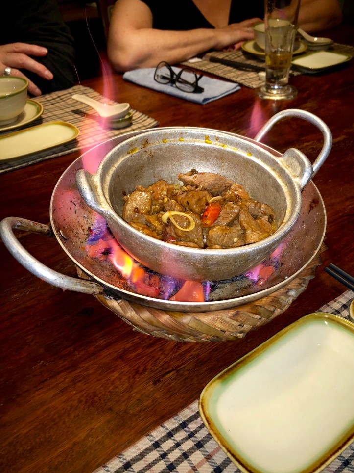 The other restaurant that we tried was called Home – recommended to us by Hung. I wasn’t overly keen on one of the others that was recommended which was just one choice of a sort of fish hotpot. Traditional and like street food but I just felt I’d avoid fish whilst I had the option so I took 4 others off here – no idea what it was going to be like but it was utterly delicious I must say. By far the most expensive of meals that we would eat in this country but not really expensive for UK prices. Everyone’s (well mine didn’t) meal came on a bed of fire as it sat in a sort of Balti dish in front of you as you ate your way through it with the sticky rice accompanying it.