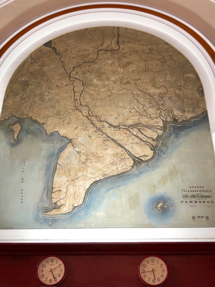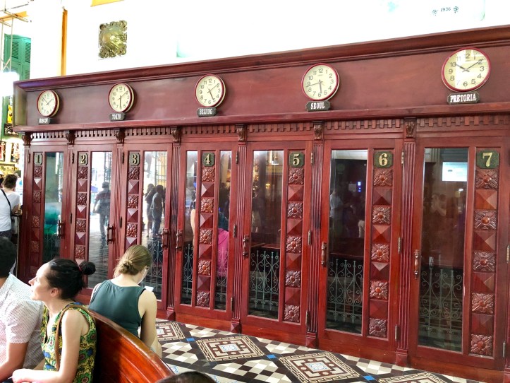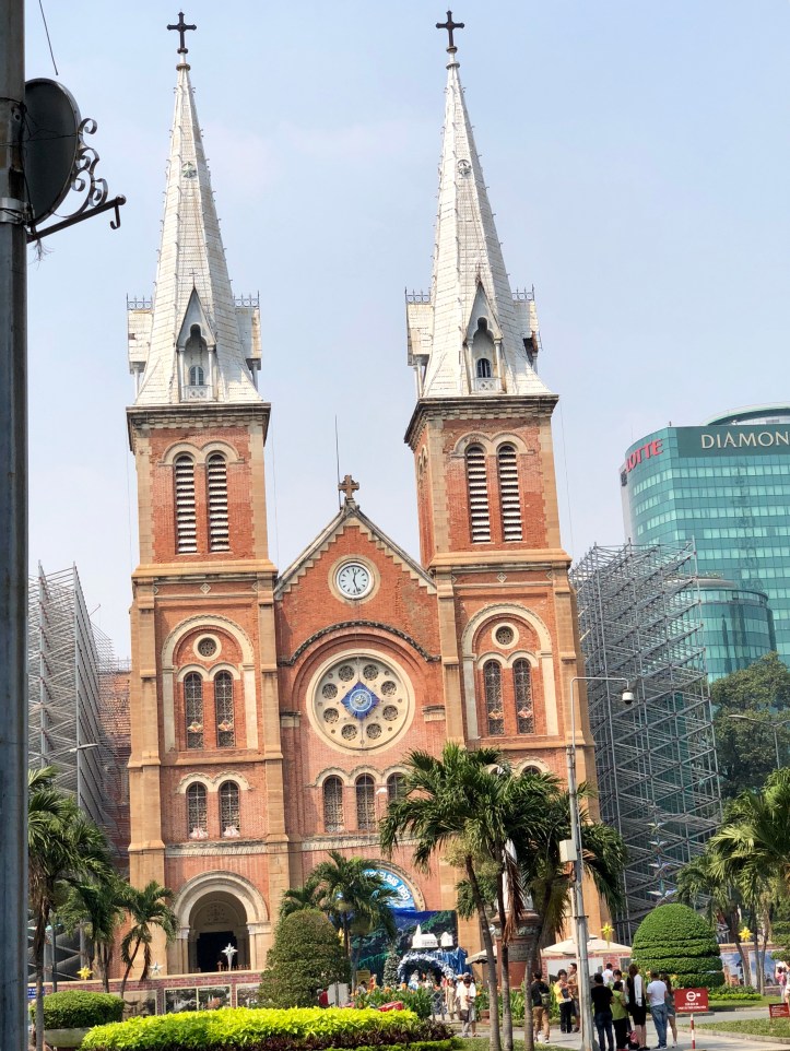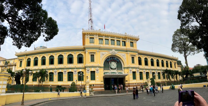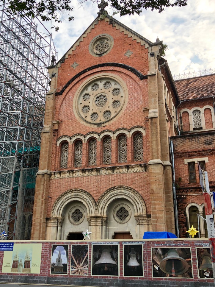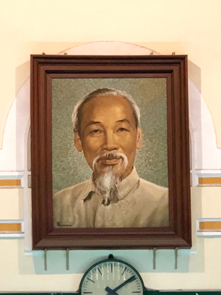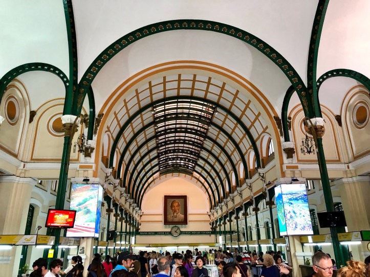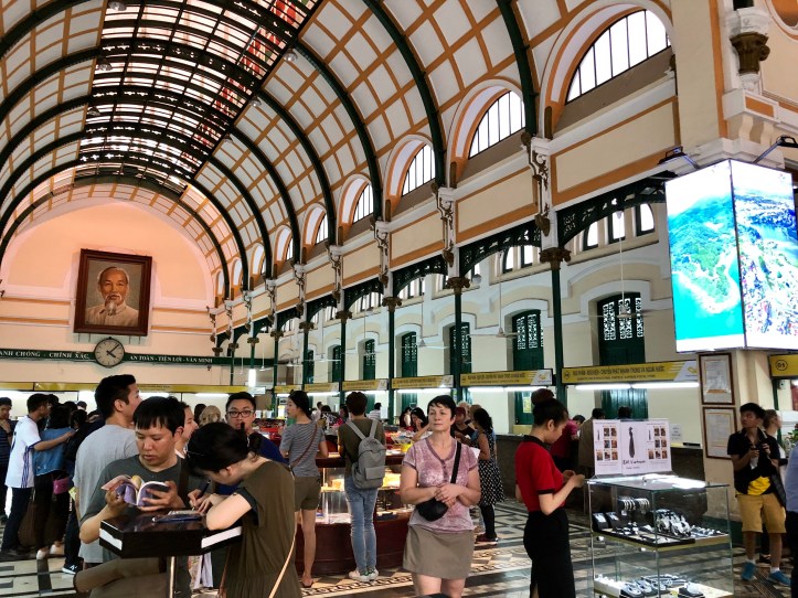 Other sites that we passed on our walk were the Opera House, which is near to the construction of the new metro system. We saw the Notre Dame Cathedral which was a rose brick colour and built between 1877 and 1883. Its based in an area of the city known as the city’s government quarter. Being so close after New Year and so close to Tet, we did find that most of the places that we were keen to see the inside of were not actually open, I think I would have liked the opportunity to explore the city a little more I have to say. The impressive towers of the cathedral, Hung told us were around 40m high and the top bits are iron spires. Its still an operating Catholic Church. The Central Post Office we did get an opportunity to look inside of and it was fascinating – a HUGE portrait of Uncle Ho (obviously) took the main position and line of sight as you entered the building.