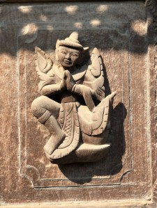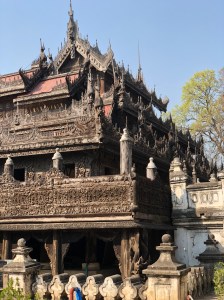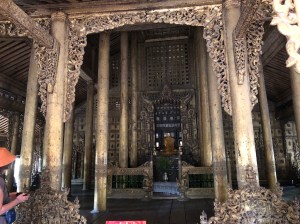 Our next location was a quick bus trip across the city (THANK GOD FOR AN AIR-CON REPRIEVE!!) to the magnificent Shwenandaw Monastery all made out of teak, some seriously intricate carving work. It was a beautiful looking building but what made it all the more fascinating was the fact that the WHOLE BUILDING had been moved from inside the walls of the palace where it was originally built as a residence for King Mindon. Unfortunately he passed away isn’t he building and so he decision was taken to turn it into a monastery and to move it to the position it now sits in. His son thought this to be incredibly unlucky, but by moving it to its current position prevented it from being burnt to the ground during World War II like so many other buildings in the palace at the time. The depictions that adorn the walls and roof of the building are Buddhist myths and Jataka stories. It was mesmerising the detail that was contained in the carvings and I did wonder how long it must have taken to create. Outside of the entrance there seas a local artist who was creating pictures from ink and a razor blade, not just any pictures, beautiful ones. Of course I ended up in buying one, but I had spent a while filming him creating a piece which I found utterly fascinating. Kudos to Zar Zar for pointing him out!