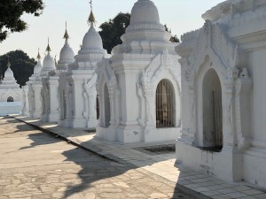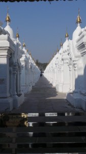 We started off our day by visiting a fairly impressive site, as sites go – the World’s LARGEST book that is situated at Kuthodaw Pagoda. The book is the entirety of the Buddhist scriptures which are written on 729 marble slabs each housed in its own individual mini-stupa. They were commissioned by King Mindon in 1857 and took more than a decade to complete the total of mini-stupas on the site though is actually 730 as there is one that holds a slab describing the creation of the complex. It’s a pictorial haven and I spent most of my time trying to capture the scale of the place and the mass of slabs without getting loads of people in the pictures! Unfortunately during the British rule the site was quite heavily damaged with a number of bricks from the stupas used for building military roads but thankfully they have all since been rebuilt.
