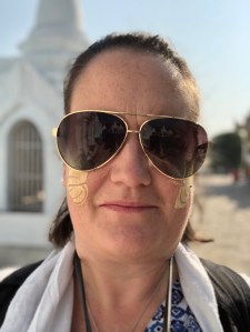 Here we were also able to try thanaka that we had seen Zar Zar wearing on her face to help protect her from the sun. It’s a natural product that is ground into a paste with a little water as she showed us and several of us then had it on our faces too – nothing like looking like a PROPER tourist by getting in with a local tradition! I mean clearly mine was never going to last very long as I had he whole Niagra falls effect in full flow down my cheeks from the heat!!